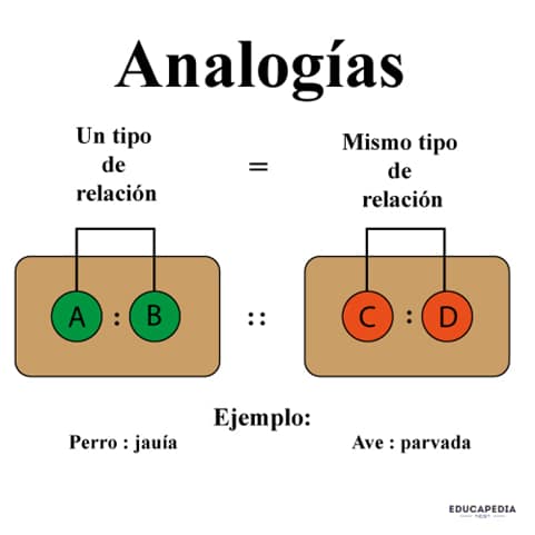 La analogía es una comparación entre dos tipos de relaciones. Como ya vimos, existen diferentes tipos de relaciones entre las palabras, por lo que una analogía utiliza un tipo de relación entre dos entidades para formar otra relación.