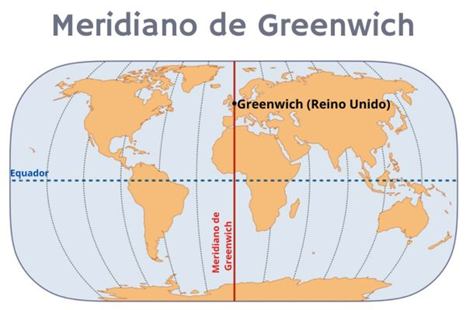 - El Meridiano de Greenwich (0°) marca el Tiempo Universal Coordinado (UTC).