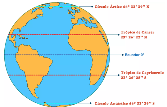 - Trópico de Cáncer y Trópico de Capricornio: delimitan las zonas tropicales.