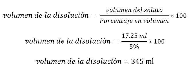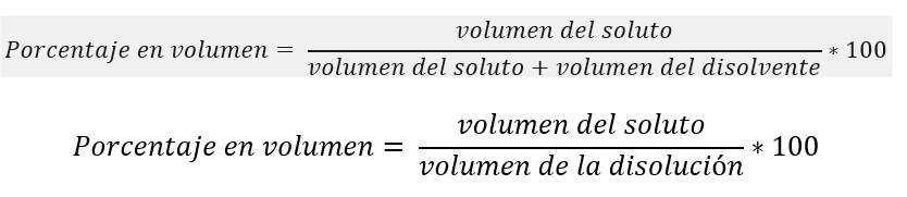 El porcentaje en volumen es la división del volumen de un soluto entre el volumen de la disolución, multiplicado por 100.