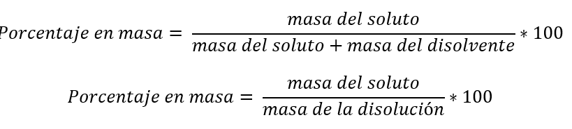 El porcentaje en masa (también llamado porcentaje masa en masa o peso en peso) es la división de la masa de un soluto entre la masa de la disolución, multiplicado por 100.
