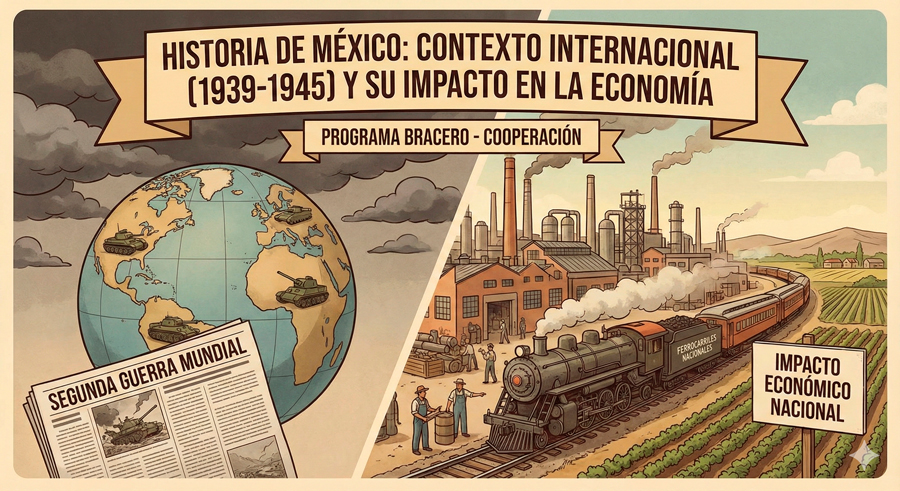 La Segunda Guerra Mundial (1939–1945) fue un conflicto global que involucró a las potencias más importantes del mundo. México no participó directamente al inicio, pero al volverse aliado de Estados Unidos, terminó teniendo un papel económico clave.