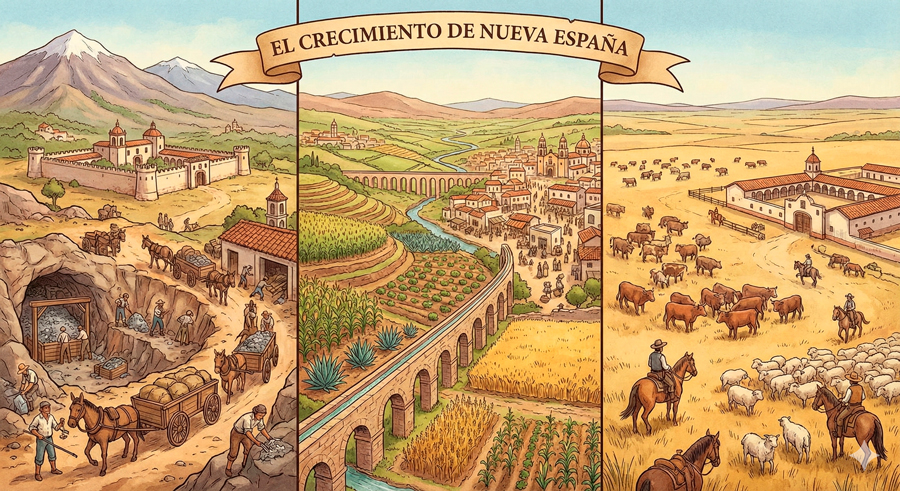 El tema El crecimiento de Nueva España analiza cómo la economía novohispana se fortaleció gracias a tres actividades clave: la minería, la agricultura y la ganadería. Estas actividades no solo impulsaron el desarrollo económico, sino que también transformaron la sociedad y el territorio, preparando el camino para cambios políticos y sociales posteriores.