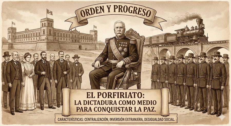El periodo conocido como El Porfiriato abarca de 1876 a 1911 y fue gobernado principalmente por Porfirio Díaz. Bajo su mando, México vivió un proceso de modernización, avances tecnológicos y crecimiento económico. Sin embargo, todo esto ocurrió gracias a un gobierno autoritario, que limitó la libertad política y controló a la población mediante la frase: “Poca política y mucha administración”.