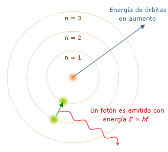 - 3.-El electrón solo emite o absorbe energía cuando pasa de una órbita permitida a otra. En dicho salto emite o absorbe un fotón cuya energía es la diferencia de energía entre ambos niveles