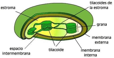 Los cloroplastos están formados por una doble membrana externa llenas de un medio semilíquido llamado estroma.