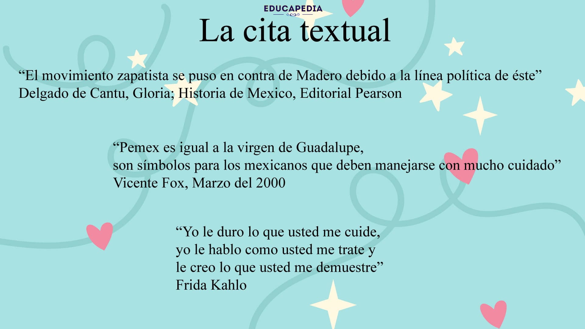 La cita textual puede ir acompañada del nombre del autor y la fuente de donde se extrajo. Esta se coloca entre comillas.