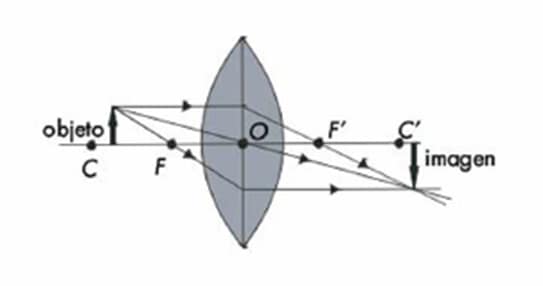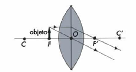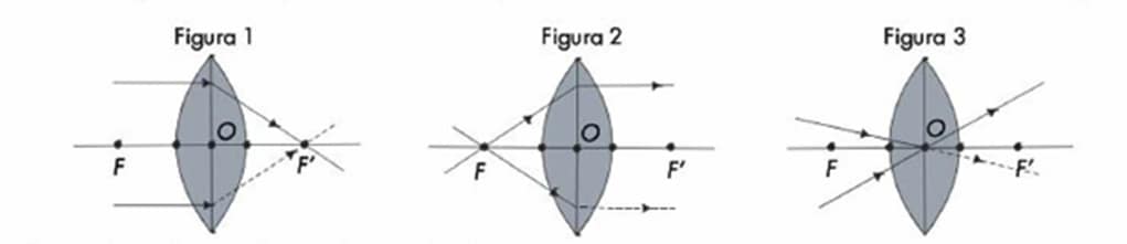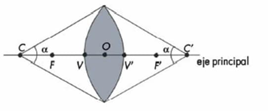 - -F y F´ son los focos de las caras del lente, ubicados entre el centro óptico y los centros de curvatura