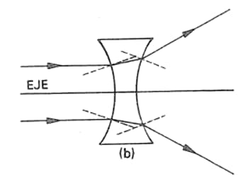 Los lentes divergentes son aquellos lentes que están más gruesos en los bordes que en el centro y los rayos paralelos que los atraviesan se “expande” en la salida, es decir, se vuelven divergentes.
