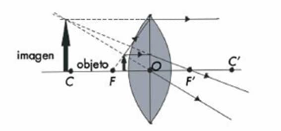 2.-Cuando el objeto se encuentra entre el foco y la lente: