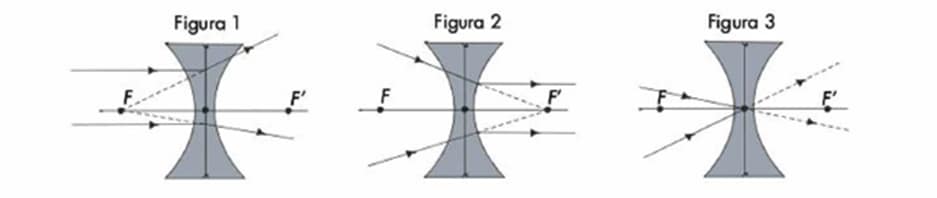 B) Si el rayo que incide se dirige al foco del otro lado del lente, el rayo refractado saldrá paralelo al eje del lente. (figura 2)