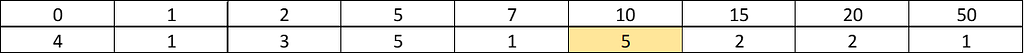 Los dos datos que se encuentran a la mitad es 5 y 5. El promedio de estos es 5.
