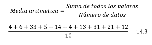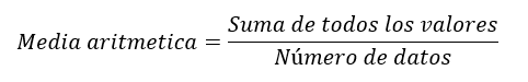 La media aritmética, también llamado promedio es la medida de tendencial central que se obtiene sumando todos los valores y luego dividiéndolo entre el número de datos.