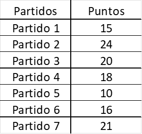 - 3.- El entrenador del equipo de basquetbol quiere saber cuándo puntos en promedio encesta su mejorar tirador, por lo que te proporciona los siguientes datos y te pide que le digas el resultado.