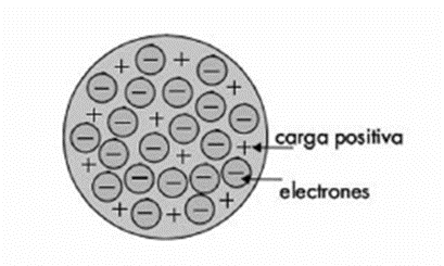 El átomo es un tipo de esfera que contiene cargas positivas distribuidas en su superficie (a manera de pasas) y las cargas negativas están incrustadas dentro de la esfera distribuidas en capas.