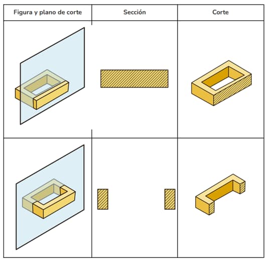 Un corte o sección de una figura ocurre cuando un sólido es atravesado por un plano.