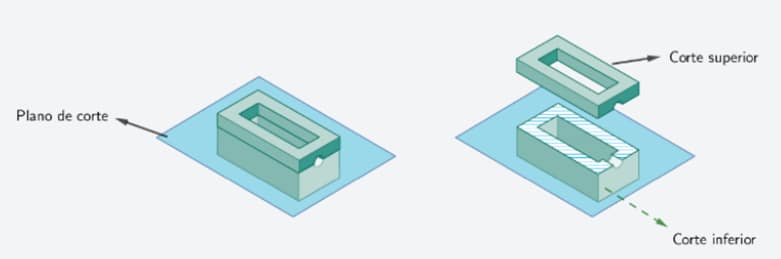 - Los cortes de figuras, que muestran el interior de un sólido al “seccionarlo” con un plano.