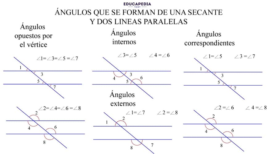 Cuando cortamos dos líneas paralelas por medio de otra línea llamada secante, se forman 8 ángulos con las siguientes propiedades.
